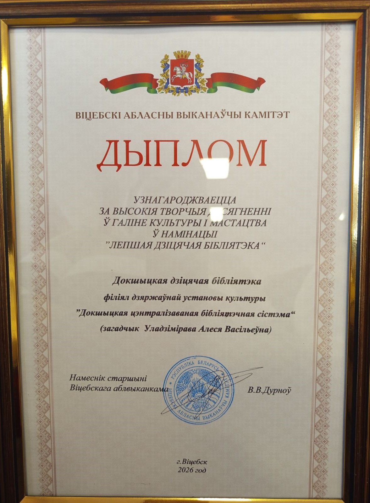 За высокие творческие достижения в области культуры и искусства по итогам работы за 2025 год коллектив Докшицкой детской библиотеки стал обладателем премии Витебского облисполкома в номинации «Лучшая детская библиотека»