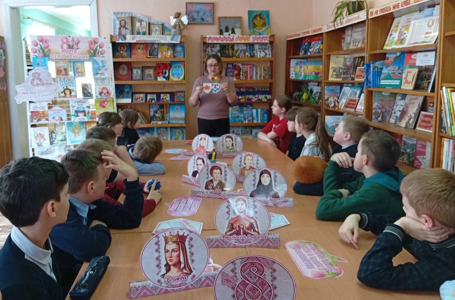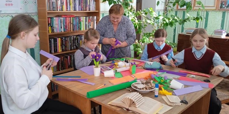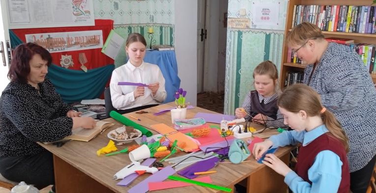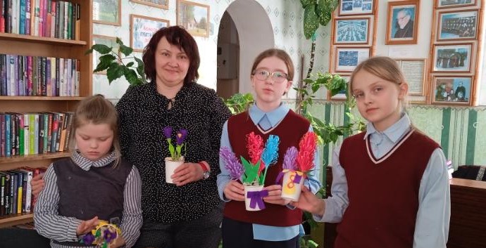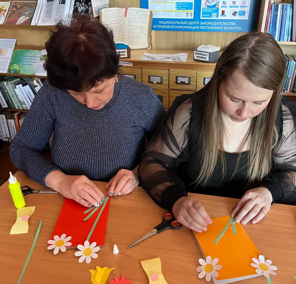 Бегомльская горпоселковая библиотека им. П. Панченко собрала детей в творческую мастерскую ”Цветы для милых и любимых“, которая была посвящена Году белорусской женщины. В ходе мероприятия учащиеся 4 класса Бегомльской средней школы им. С.С. Манковича познакомились с историей праздника, с выдающимися белорусскими женщинами, а затем с интересом и азартом делали любимым мамам поздравительные открытки.